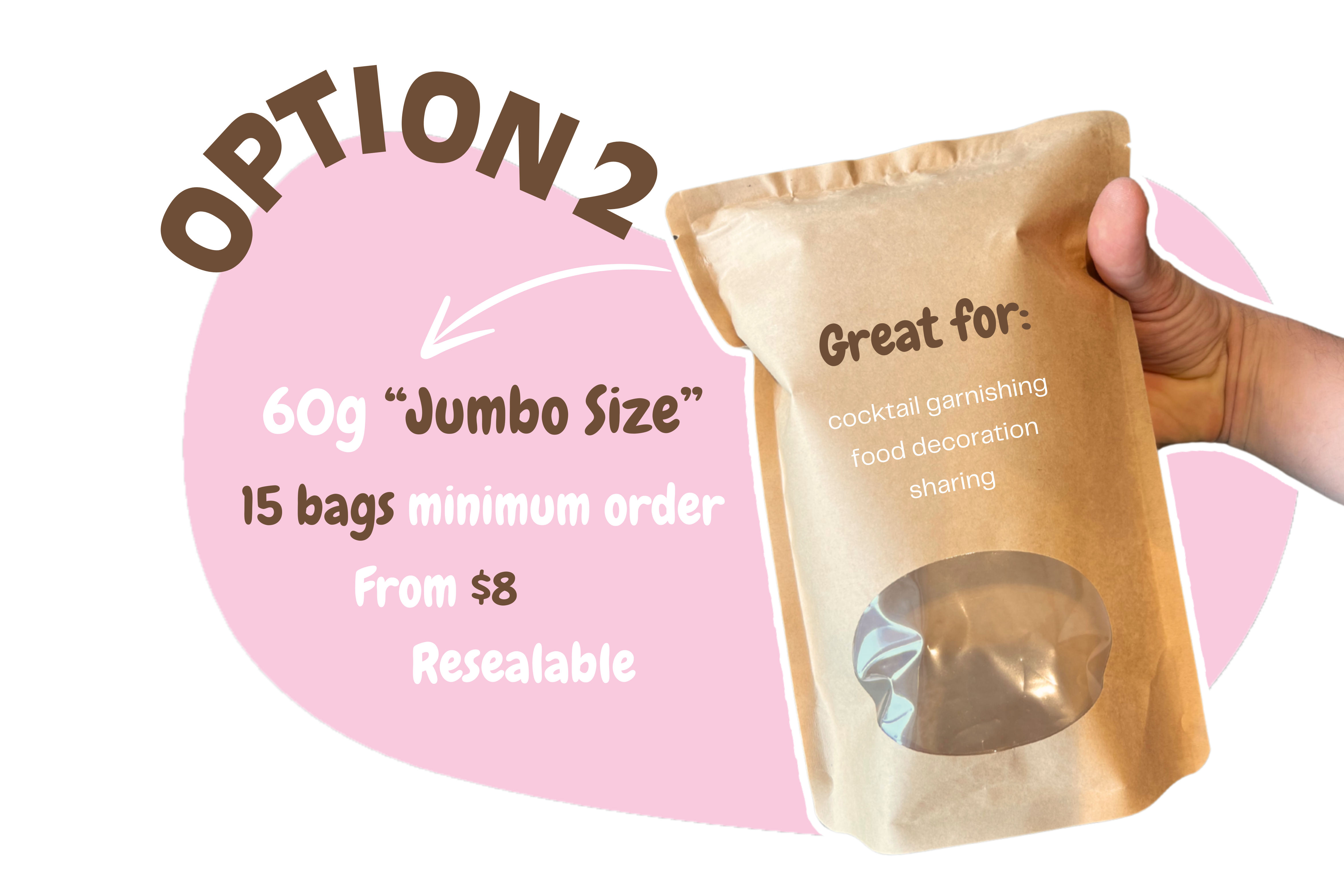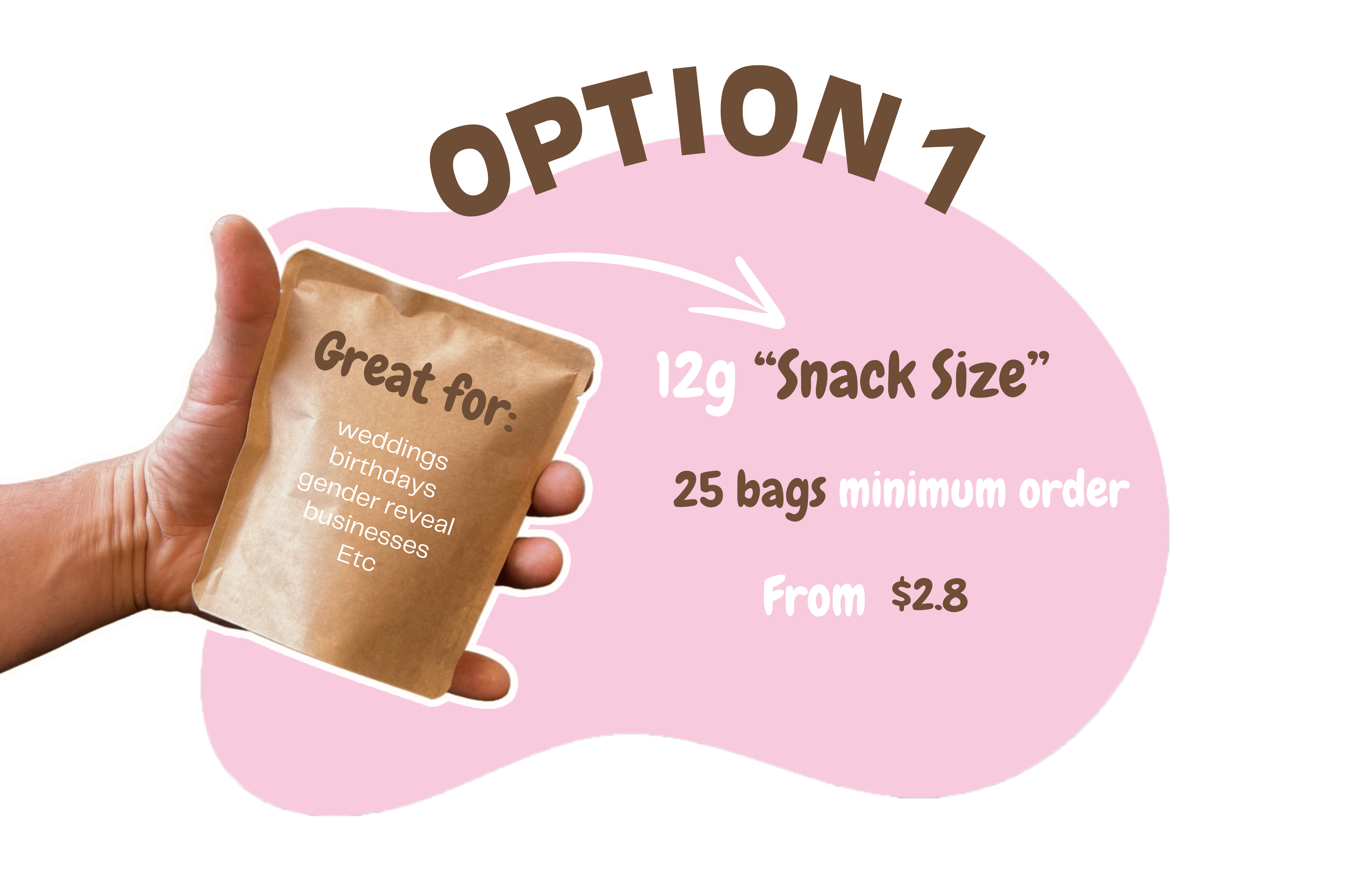 Custom orders are crafted from scratch requiring significant prep, hence moq's. Pricing for customised candy floss is determined by the schedule on the right → more bags, greater discount.