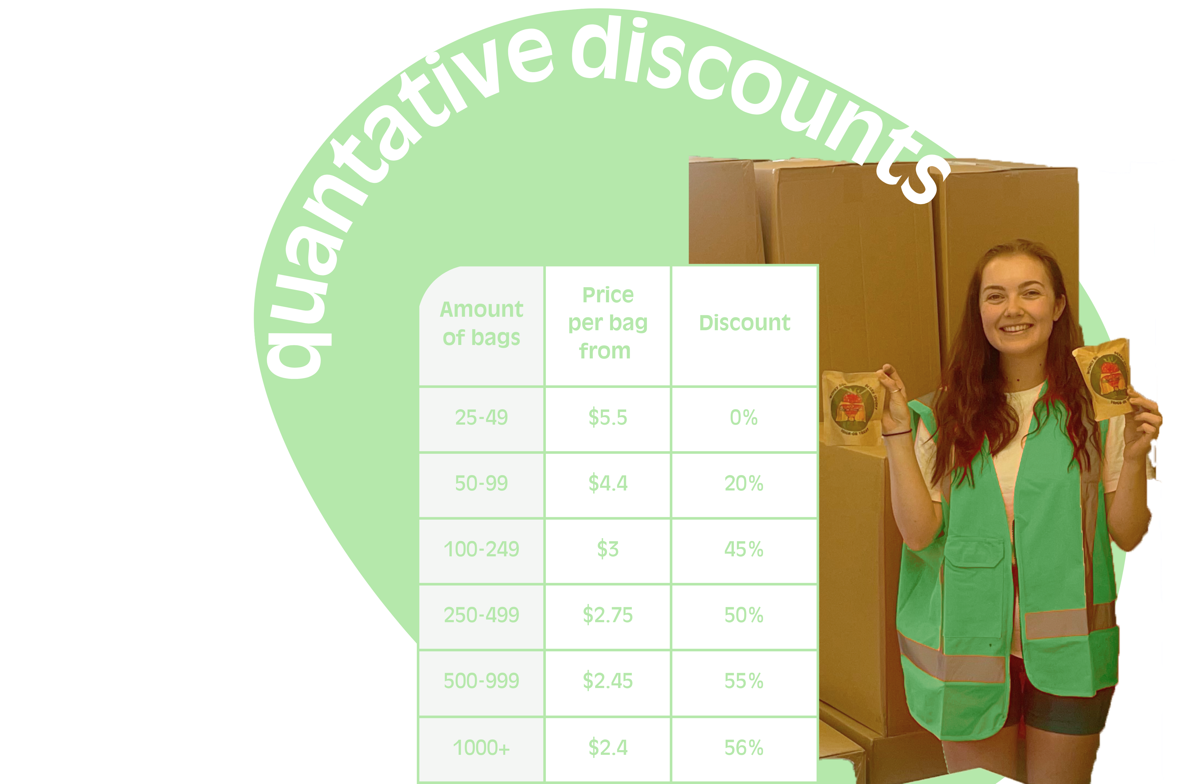 Buy 100-249 bags $3 per bag + add-ons | get 45% Off |