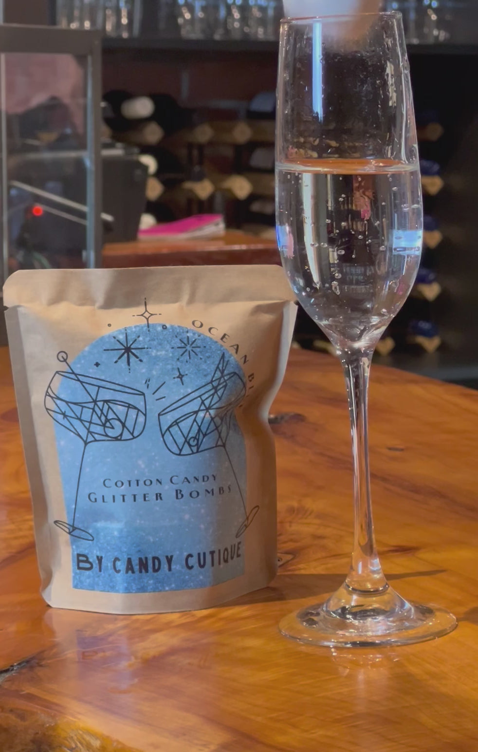 Get ready to add some sparkle to your drink with our hand-spun puffs of cotton candy in glittery blue ocean! Just rip, drop, pour, and sip for a touch of magic in every bubbly sip! Each bag contains 2 Glitter Bombs filled with edible glitter, ready to dissolve in your favourite beverage and transform it into a whimsical, sweet delight.